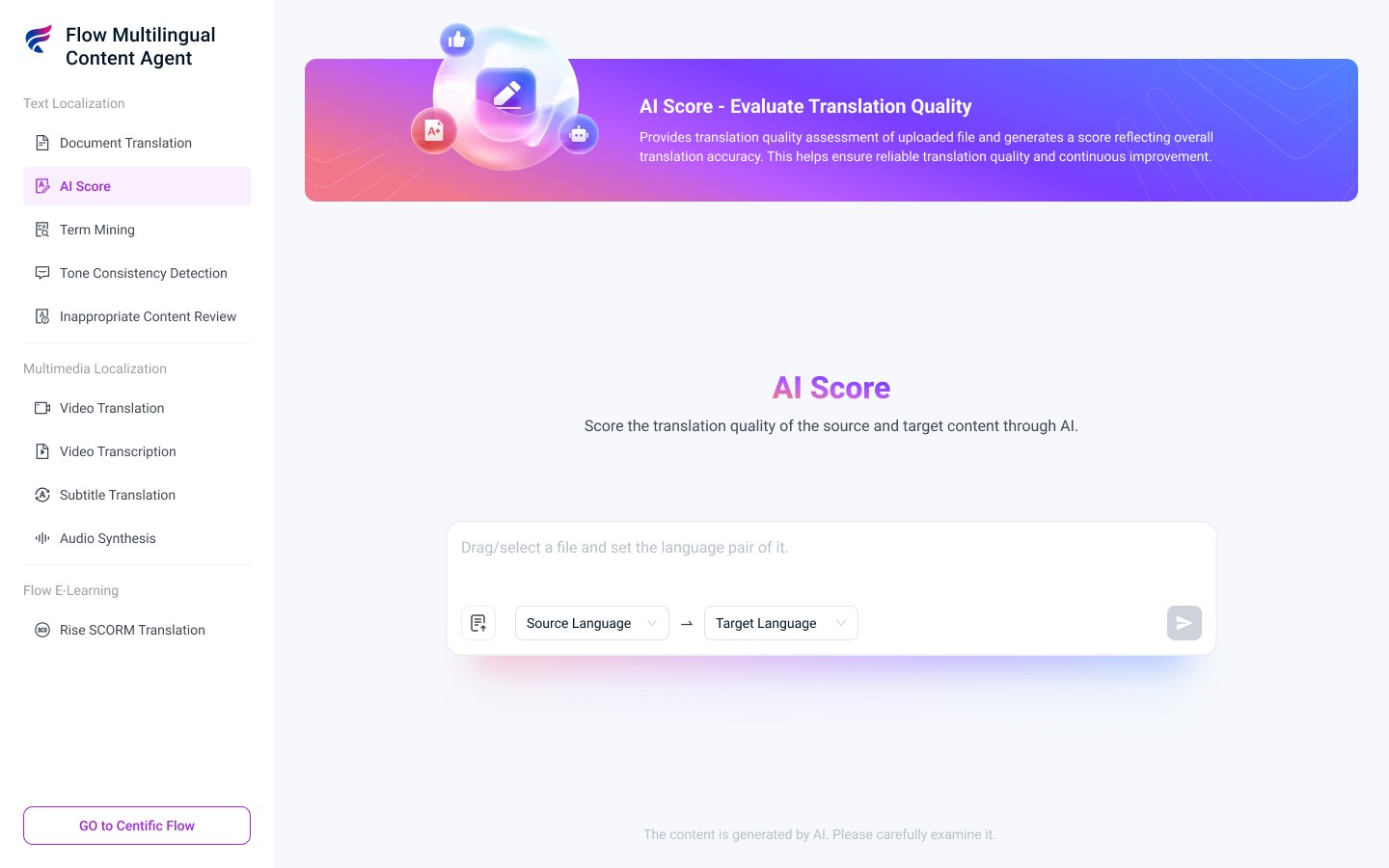 Flow brings source analysis, translation, and quality evaluation together, so that organizations can: