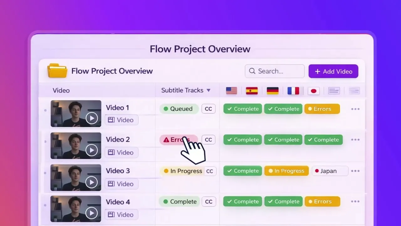 Upload an SRT file and Flow returns production-ready subtitles in multiple languages that are fast, accurate, and downloadable, without breaking timing or formatting.